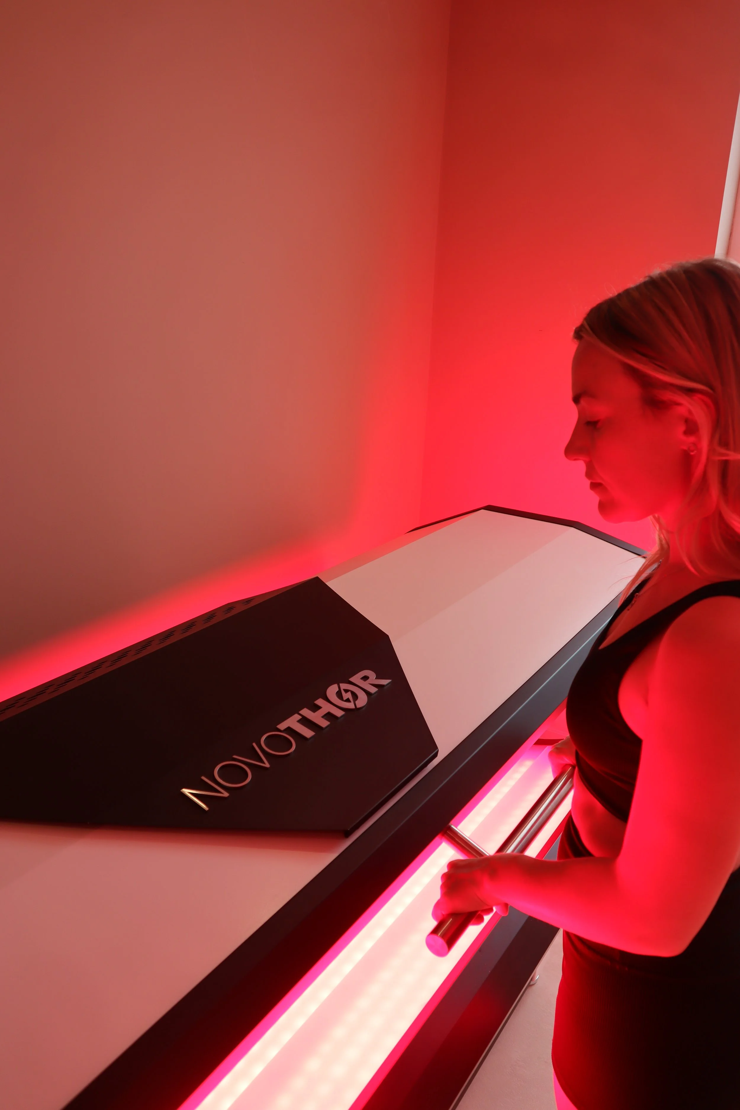 The NovoTHOR is a whole-body therapy bed that bathes the user in clinically proven red (660nm) and near-infrared (850nm) light across every major muscle group and joint. The session is completely passive—just lie down and let the light do the work.